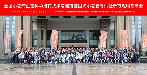 2018年5月21日—22日,由全國農業技術推廣服務中心主辦,河南省植物保護植物檢疫站、河南省漯河市農業局、四川國光聯合承辦的全國小麥病蟲害科學用藥技術培訓班在河南省漯河市召開。全國農業技術推廣服務中心農藥與藥械處處長王鳳樂、副處長張帥、河南省植物保護植物檢疫站站長李好海、副站長韓世平、漯河市農業局局長齊建偉、中國農科院麻類研究所所長,中國植保學會理事長陳萬權、中國農科院植保所研究員李香菊出席大會。本次大會立足于“農業有干頭、農村有看頭、農民有盼頭”的鄉村振興課題,針對小麥的病蟲害科學用藥技術作了廣泛研討,吸引了全國小麥主產區植保系統的領導專家、種植大戶、農資渠道商共300余人到會。