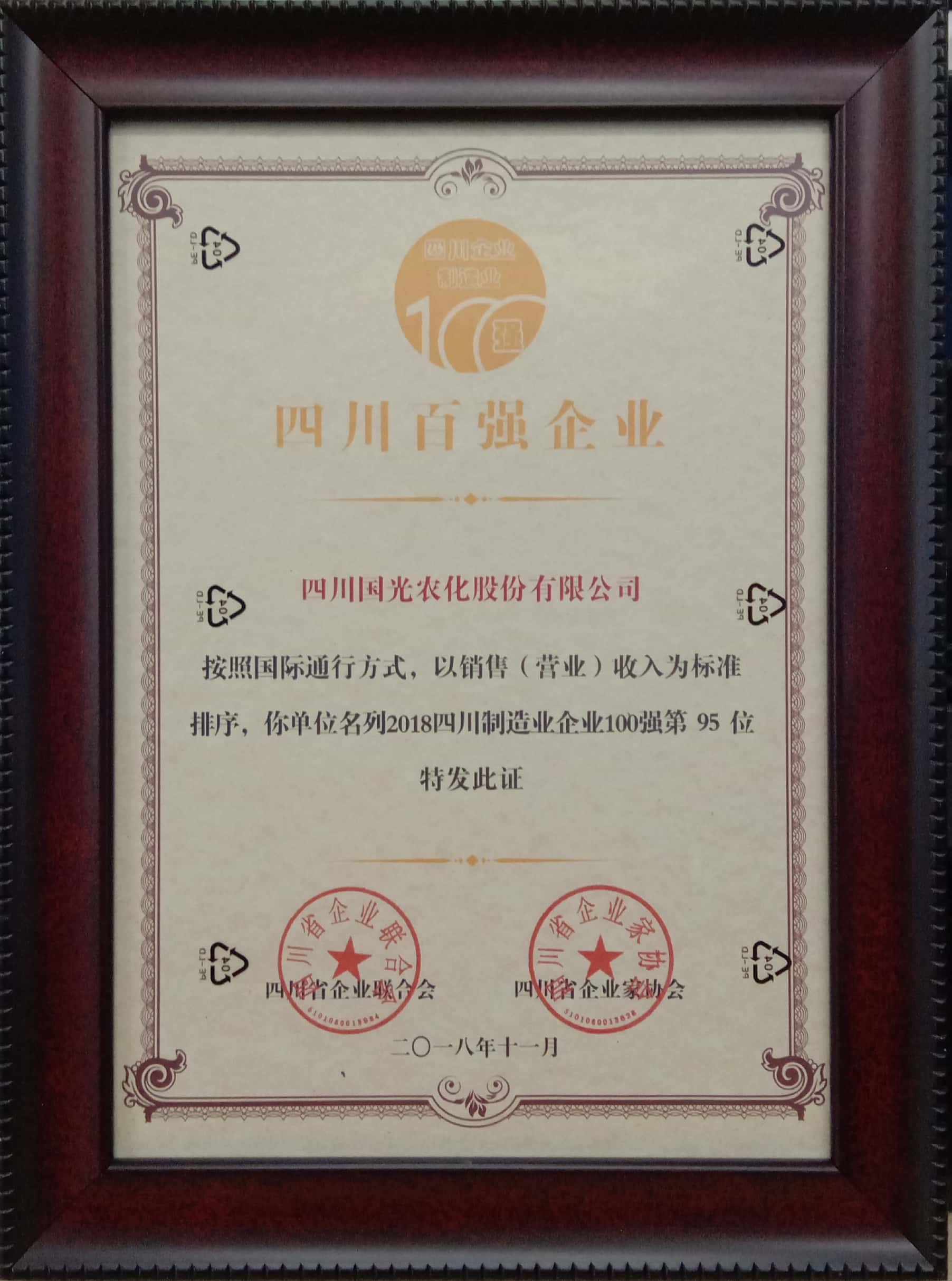 在這次評選活動中,國光股份榮獲“2018四川省制造業百強企業”榮譽稱號。